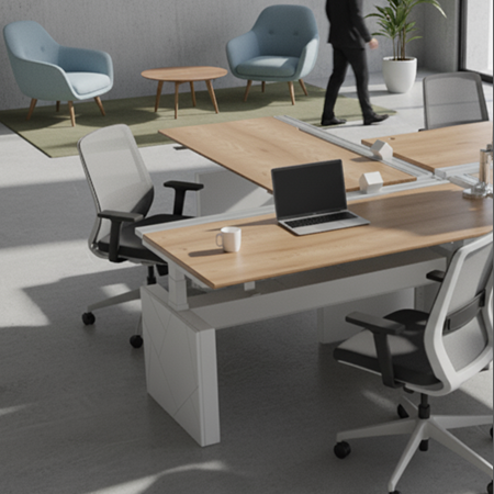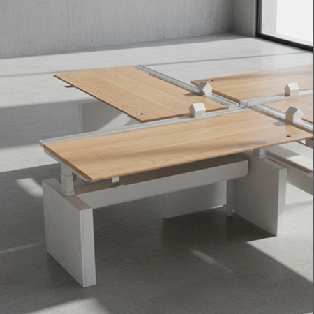 Smooth electric lift with memory presets, anti-collision safety, and low-noise motor; reinforced columns support up to 800 N. Modular, sensor-integrated design with energy-efficient control and plug-and-play setup for flexible workspaces.